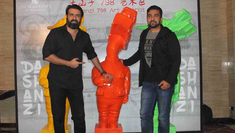 Raj Kundra and Harman Baweja get goofy against the structures behind them.